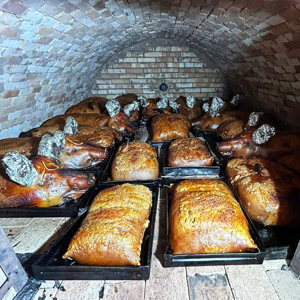 Horneado finalPara conservar el mejor sabor, todas nuestras lechonas se doran lentamente en nuestros hornos de ladrillo a temperatura y tiempo controlados.